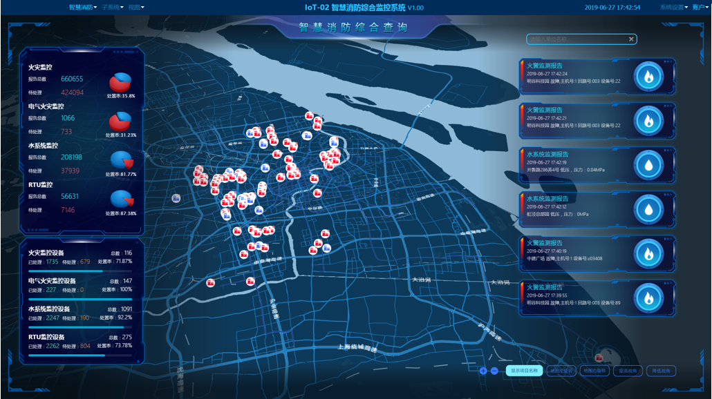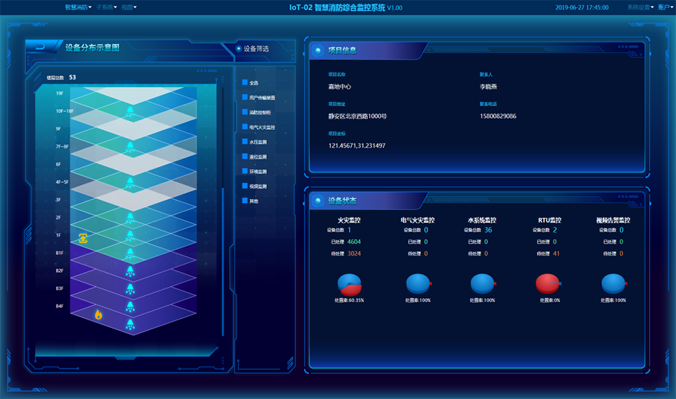 為項目配備智慧消防管理平臺,擁有消防設施設備管理功能,以及火災報警監測、水壓及水位監測、水泵控制柜狀態監測、巡檢任務監測等七大應用,搭配智慧消防硬件,提升消防管控水平。