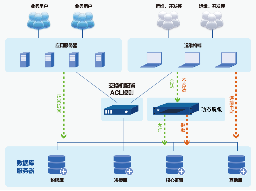 數(shù)據(jù)庫動態(tài)脫敏系統(tǒng)接入數(shù)據(jù)中心,無需改造業(yè)務(wù)。識別敏感數(shù)據(jù)并做好分級分類標(biāo)簽,通過人員管理、終端管理、工具管理、應(yīng)用程序管理、訪問操作等多要素進(jìn)行訪問身份管理,實現(xiàn)了數(shù)據(jù)庫的準(zhǔn)入管理、數(shù)據(jù)對象的訪問管理、特權(quán)用戶的安全規(guī)范管理、敏感數(shù)據(jù)授權(quán)訪問管理。